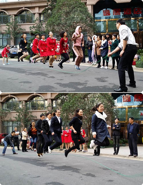 每支代表隊(duì)共有8人(搖繩2人,跳繩6人)參賽,比賽時限3分鐘,以跳躍成功次數(shù)多少排出名次。賽場上,只見參賽隊(duì)員身輕如燕,上下躍動,隨繩起舞。有時由于各隊(duì)員動作不協(xié)調(diào)而使跳繩中斷,但在隊(duì)長的口令下,身心經(jīng)過短暫調(diào)整后,又繼續(xù)比賽,沒有放棄;有的參賽隊(duì)多次出現(xiàn)跳繩中斷,但他們沒有氣餒,“我們的目標(biāo)是30個!”通過這種設(shè)定目標(biāo)個數(shù)的方式為自己打氣,達(dá)到目標(biāo)后,又不斷調(diào)高目標(biāo)為自己加壓,“我們的目標(biāo)是50個!”跳繩要講究技巧,搖繩同樣需要恰到好處的力道和技巧,但見有的參賽隊(duì)的年長隊(duì)員老當(dāng)益壯,時而俯身搖繩,時而起身為跳繩隊(duì)員加油打氣。現(xiàn)場觀眾也是凝神屏氣,數(shù)著跳繩個數(shù),為參賽隊(duì)員鼓勁助威,“……119,120,121!”現(xiàn)場歡呼雀躍,荊門逸居酒店一隊(duì)以121個的絕對優(yōu)勢奪取冠軍。