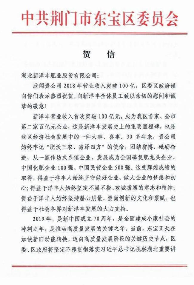 4月12日,湖北新洋豐肥業股份有限公司發布公告,2018年新洋豐營業收入首次突破百億大關,達到100.3億元。當日,東寶區委區政府向新洋豐發來賀信,稱新洋豐營業突破百億大關,成為東寶區首家、荊門市第二家百億元企業,是新洋豐發展史上的重要里程碑,也是東寶區經濟社會發展中的一件大事。