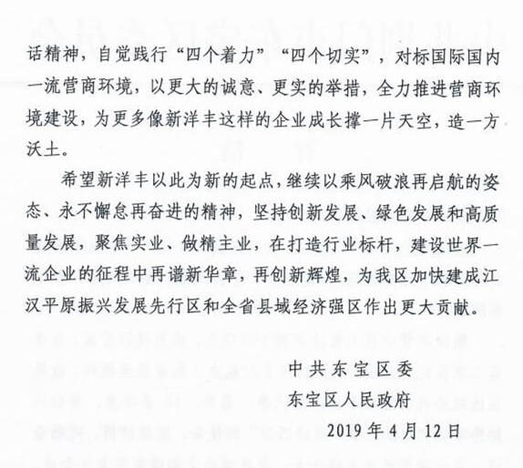 東寶區委區政府在賀信中對新洋豐過去三十年的發展給予充分肯定,并表示東寶區將全力推進營商環境建設,為更多像新洋豐這樣的企業成長撐一片天空,造一方沃土。